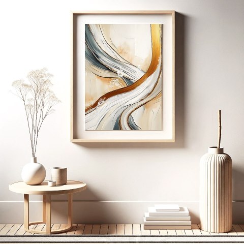 Ten plakat, z wyjątkową abstrakcyjną kompozycją, niewątpliwie przyciąga wzrok. Wykorzystanie dynamicznych linii i krzywizn wprowadza do niego wrażenie ruchu i płynności, co podkreślają stonowane barwy - biel, złoto, szarość i odcienie beżu. Złote detale dodają całości elegancji i luksusu, tworząc subtelną, ale efektowną połyskliwość. Wykorzystanie techniki impasto, sugerowane przez bogatą fakturę obrazu, dodaje mu głębi. Harmonijna kompozycja łączy w sobie zimne i ciepłe barwy, co, mimo kontrastu, wprowadza do wnętrza spokój. Jego złożoność intryguje i pozwala na wiele interpretacji. Idealnie wpasuje się zarówno w minimalistyczne, jak i klasyczne aranżacje, stanowiąc centralny punkt dekoracyjny. Wyglądać będzie doskonale w salonach, biurach czy sypialniach, dodając wnętrzu charakteru i stylu.