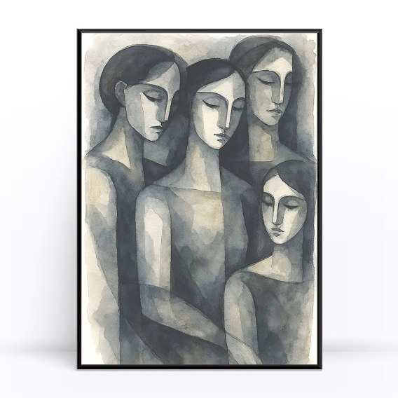 "Geometria Emocji" to wyjątkowy plakat, który wprowadzi do Twojego wnętrza nutę zadumy i refleksji. Przedstawia cztery postacie o wyrazistych, geometrycznych rysach twarzy, utrzymane w monochromatycznej kolorystyce. Dominacja odcieni szarości i czerni nadaje mu surowy, ale zarazem elegancki charakter. Bliskość postaci może sugerować emocjonalne powiązanie lub wspólnotę, co dodaje obrazowi głębi. Delikatność i subtelność kompozycji to zasługa akwareli, która kontrastuje z mocnymi liniami i konturami. Ten plakat idealnie wpisuje się w minimalistyczne, nowoczesne wnętrza oraz te urządzone w stylu industrialnym. Może stanowić interesujący akcent w przestrzeniach artystycznych, takich jak galerie czy pracownie. Jest to propozycja dla osób ceniących modernizm z elementami abstrakcji - uniwersalny i ponadczasowy wybór.