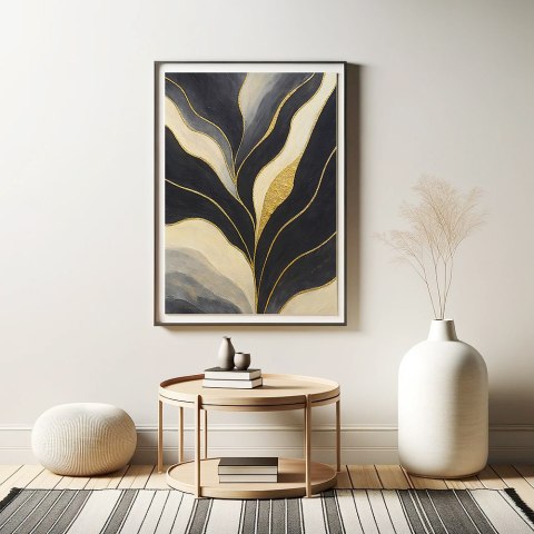 Nasz plakat, "Złote Abstrakcje", to wyjątkowe połączenie elegancji i wyrafinowania. Dominują na nim odcienie czerni, szarości i złota, tworząc spójną i harmonijną całość. Dynamiczny wzór, przypominający liście lub płomienie, nadaje całości ruchu i energii. Subtelny, ale wyrazisty kontrast pomiędzy ciemnymi a jasnymi partiami podkreśla głębię obrazu, podczas gdy złote akcenty dodają blasku. Ręczne wykonanie jest sugerowane przez widoczną strukturę i teksturę, co dodaje plakatowi artystycznego wyrazu. Nowoczesny styl z elementami glamour sprawia, że plakat doskonale pasuje do wnętrz urządzonych w stylu minimalistycznym, ale również sprawdzi się w eleganckich salonach czy sypialniach, dodając klasy i szyku. Może znaleźć swoje miejsce również w biurach, gdzie jego estetyka będzie sprzyjać kreatywności i inspiracji.